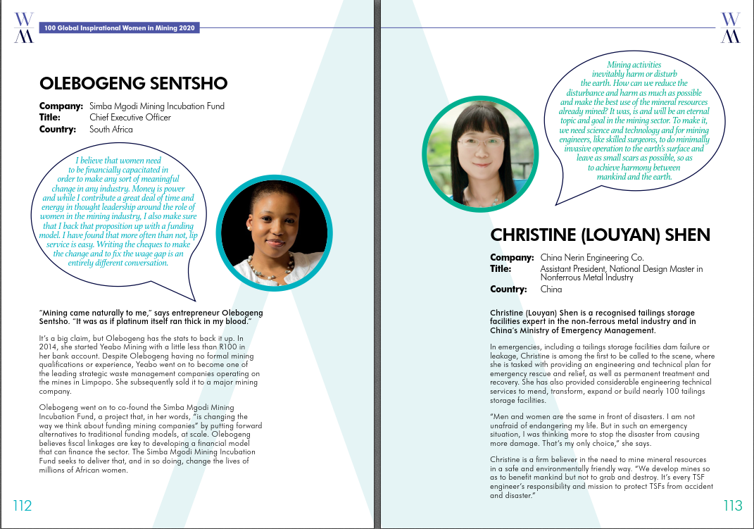 自2013年以来,“全球矿业百名励志女性”评选活动每两年举办一次,2020年度WIM 100评选标准是基于她们通过自己的工作及经验赋能于矿业,促进矿业更加安全、茁壮发展。这些能力及素质包括:勇于做出积极而有影响力的变化、倡导和赋权他人的意愿及努力;在逆境中持之以恒,正面挑战积极寻找解决方案的能力。正如WIM UK在媒体声明中所说:“本期获奖的100名女性之所以入选,是因为她们对建立更强大、更安全、更可持续的采矿业做出了令人鼓舞的贡献。”