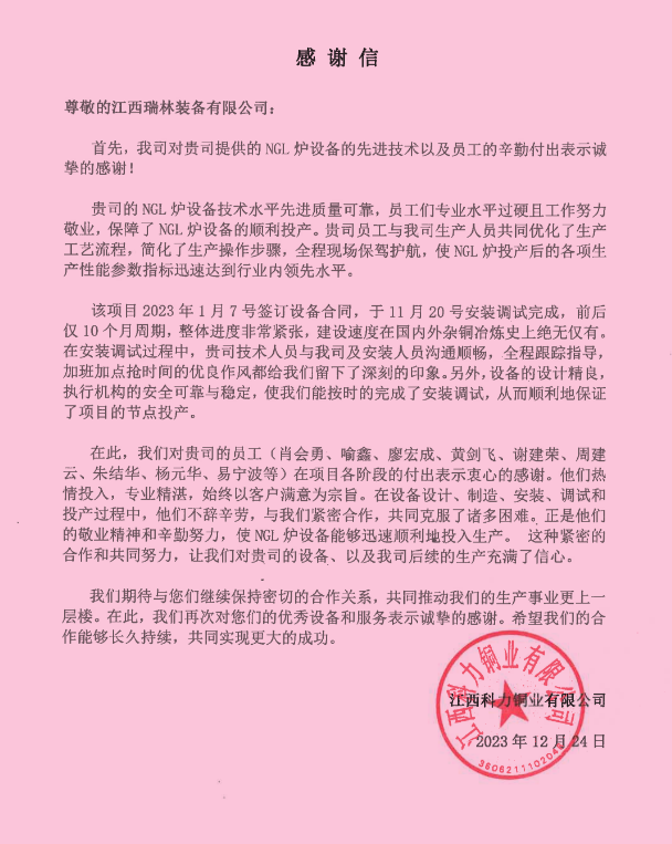 在项目建设过程中,中国瑞林充分发挥人才、技术和管理优势,仅用10个月时间,推进项目顺利进入试生产阶段,并一举投产成功,炉时、能耗等性能指标位于行业内领先水平,得到业主的充分的肯定和诚挚的感谢。业主表示期待未来继续与中国瑞林合作,促进双方高质量发展。