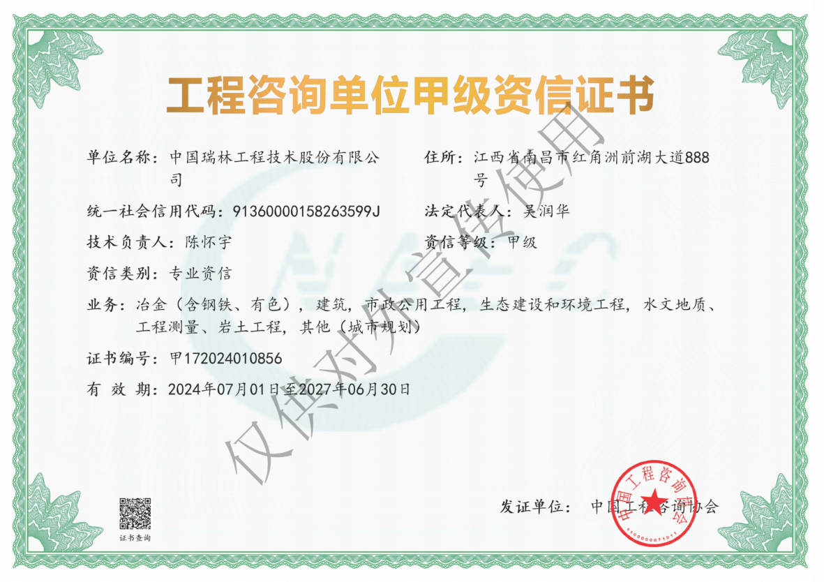 作为具有48个细分专业的国际化工程公司,中国瑞林具备包括勘察、咨询、设计、工程总承包、装备集成、数字化应用等项目全生命周期的业务能力。本次获评工程咨询甲级综合资信,彰显了公司在工程领域综合实力的领先地位,为持续推进公司高质量发展奠定了坚实的基础。