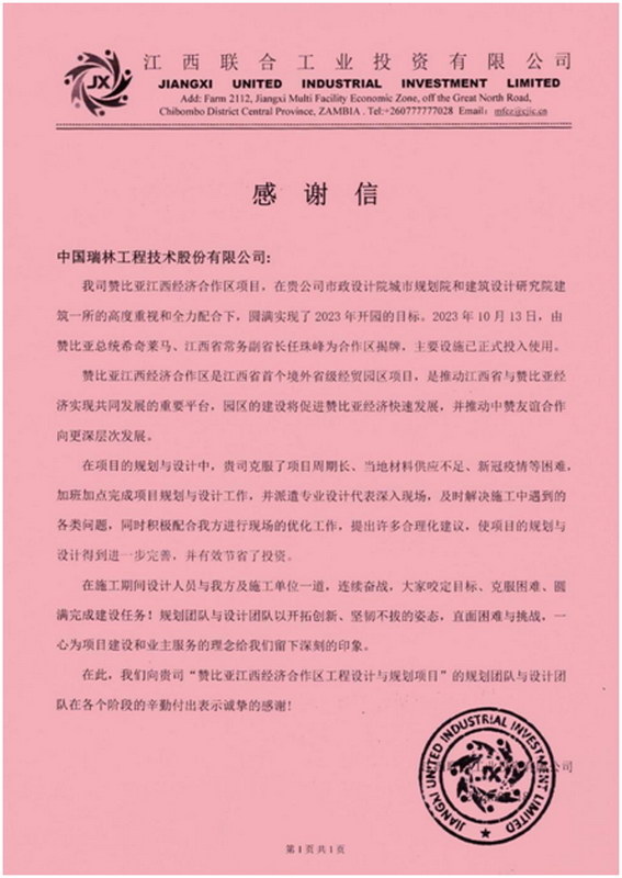 近日,江西联合工业投资有限公司发来感谢信,感谢中国瑞林在承担赞比亚江西经济合作区项目的规划与设计工作中给予了专业的技术支持,并携手业主及施工方克服各项困难,为项目圆满完成建设任务作出了积极贡献。
