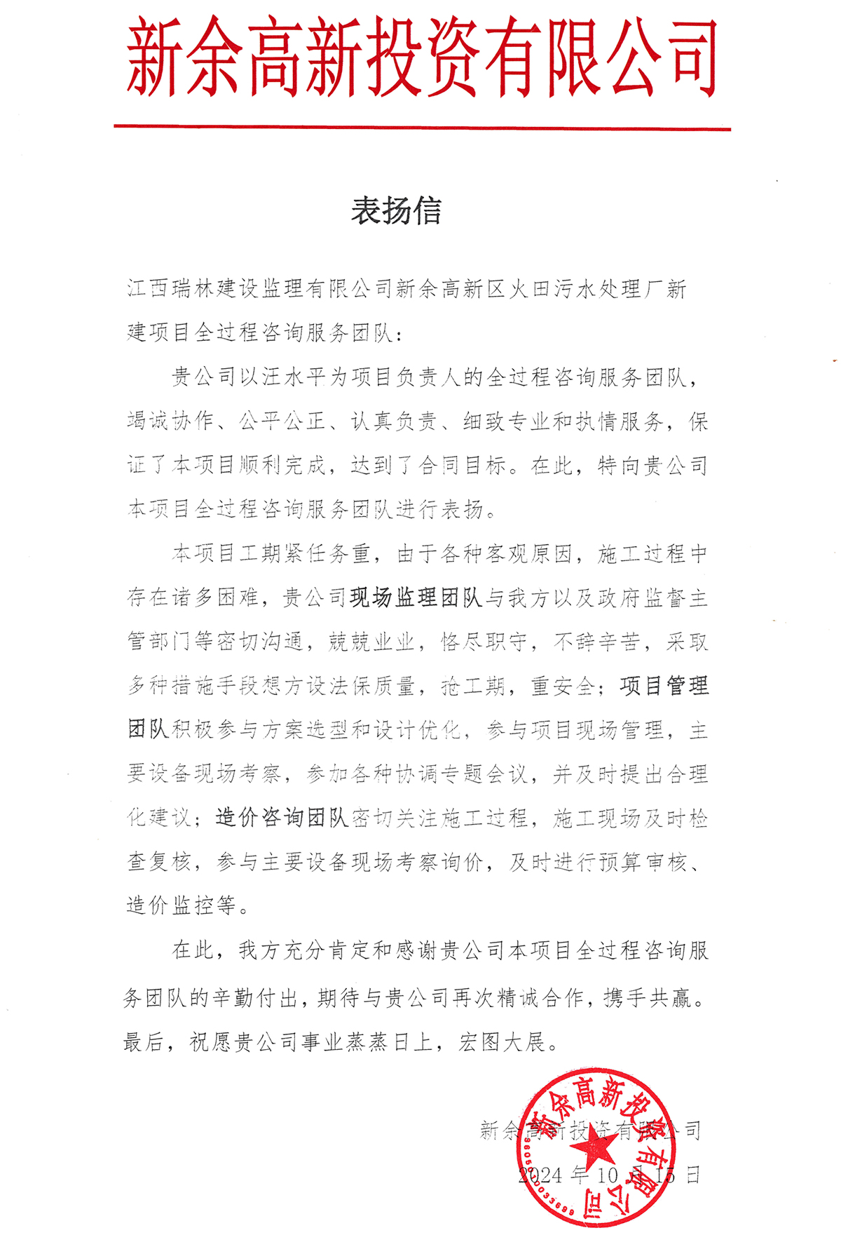 近日,中国瑞林全资子公司江西瑞林建设监理有限公司承接的新余高新区火田污水处理厂新建项目一期全过程咨询项目顺利通过竣工验收。业主也发来表扬信,感谢公司项目团队为项目所作的贡献。