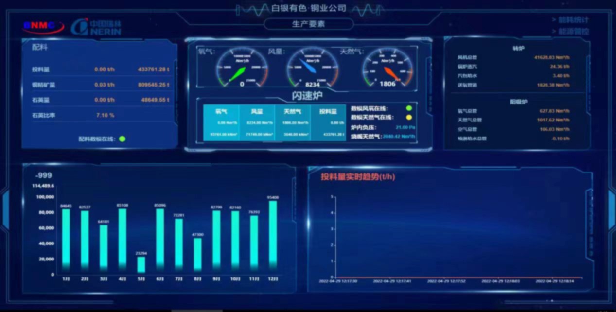 The "Industrial Internet-based Intelligent Consumption Optimization Platform for Copper Smelting" developed by Baiyin Group was selected as one of the pilot demonstration projects for big data industry development by the Ministry of Industry and Information Technology in 2020. China Nerin mobilized a technical team to demonstrate the need for developing such a platform. They analyzed the relationship between energy consumption and outputs of intermediate or final products such as matte, blister, anode, and cathode, determined key areas of high energy consumption in the production process and equipment operation, identified weaknesses in energy management, and constructed the consumption optimization model. Their hard work eventually paid off as the platform went online at the end of 2021. This platform not only enables in-depth analysis and utilization of vast production data but also serves as the foundation for setting energy-saving targets for equipment and process transformations and optimization of management processes. A number of technical solutions and measures for energy saving, emission reduction, and improvement of quality and efficiency were implemented and have already yielded positive results. The proportion of low-grade feed to the flash furnace has increased from 15% to 25%, and the converter cycles per day have risen from 3.4 to 4 batches, leading to a 19% reduction in operating costs and a 10% decrease in unit product consumption.