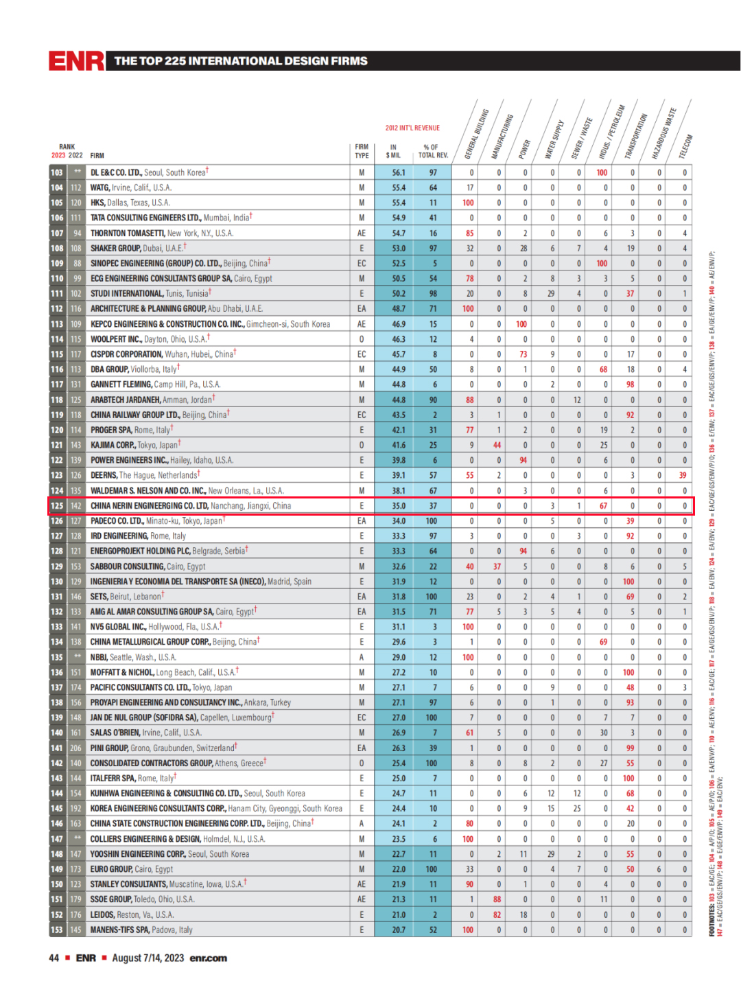 According to a news release by China International Contractors Association, Engineering News-Record (ENR) recently unveiled its Top 225 International Design Firms and Top 150 Global Design Firms rankings for 2023 a total of 23 companies from Mainland China have been listed in the T